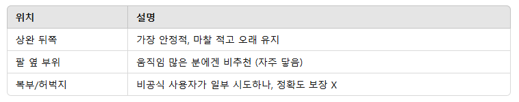 공식 권장 위치는 **상완(팔 뒤쪽)**입니다.
